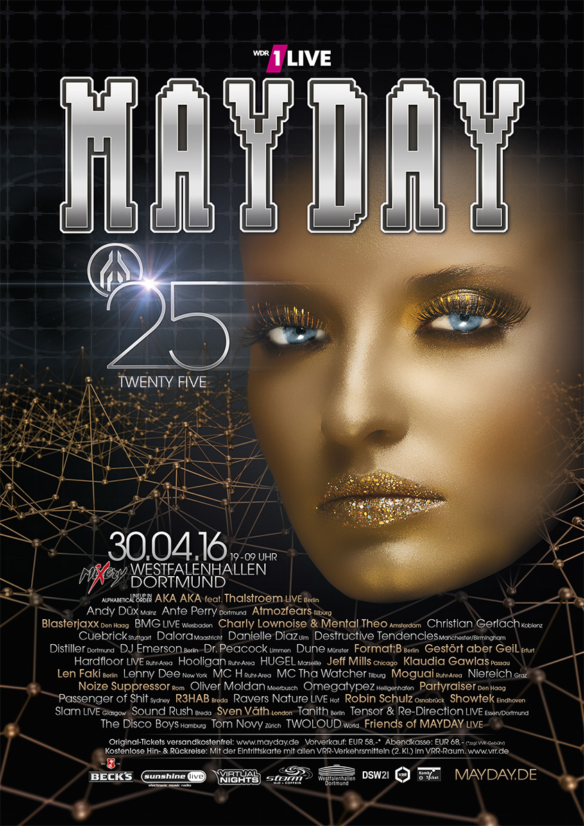 Techno ist tot, lang lebe Techno! Wusstest du, dass die Mayday als Rettungsaktion für den Berliner Radiosender DT64 entstand? Damals noch in Berlin versammelten sich rund 6.000 Technojünger im Dezember 1991 zur großen Rettungsparty. Heute, 25 Jahre später und in Dortmund, begeht die Mayday 2016 ihr silbernes Thronjubiläum mit mehr als 20.000 Besuchern und über 50 internationalen Acts in den Westfalenhallen unter dem Titel „Twenty Five“.
